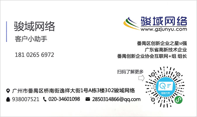 廣州駿域網絡科技有限公司成立于2005年,是一支由眾多具有多年實踐經驗的專業人士組成的高新技術團隊,專為企業提供網站建設、全網營銷、郵箱等服務,我們擁有嚴謹的程序開發(fā)人員、專業的美工設計、隨時為您效勞的售后服務人員,團隊人數達一百多人。目前我們已經榮幸的為廣州眾多知名企業提供了包括網站建設、手機網站、小程序、企業軟件開發(fā)等多種基于互聯網技術的服務。 通過長期積累,駿域網絡目前已經擁有50000多家客戶。